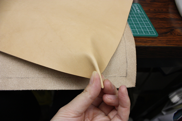 そして2枚の革を糊付け。縫う前の大事な作業です。ここをきっちりやんないと、穴あけのときにズレます。