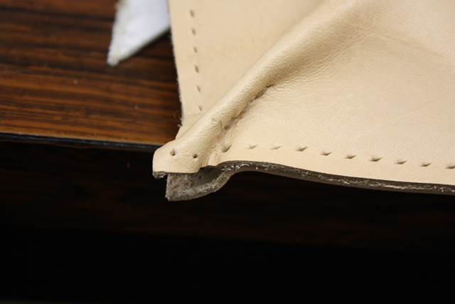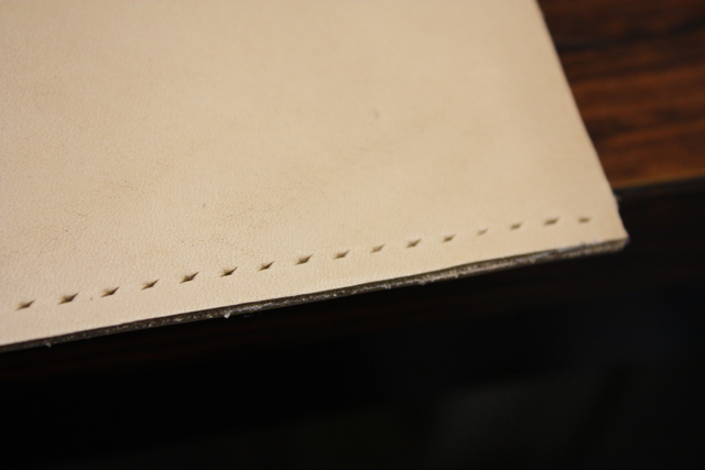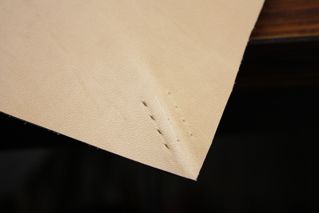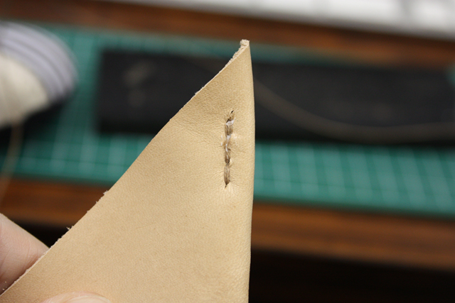 穴は完璧にズレてるし、角だから補強(返し縫い)しなきゃだし、糸は途中で切れちゃうし(これは不慮の事故)、糊がちゃんとついてないとこがあって穴あけで革のズレがでちゃったり(糊付けが大事と再認識)とかですんごい大変でした。