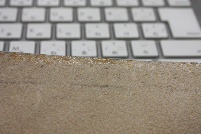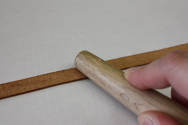 なるべく薄くのばしたあと、半乾きくらいでこういう木の棒でこすります。こうすることで、革の裏面(トコ)の毛羽立ちを抑えられる。