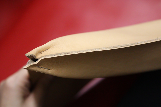 とはいっても、接着部分はちゃんと革をそいでますよ。