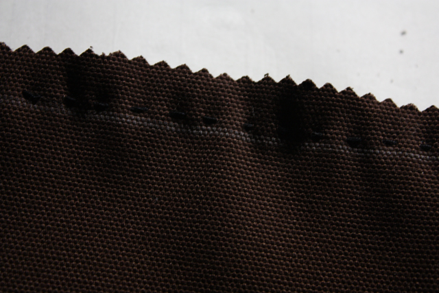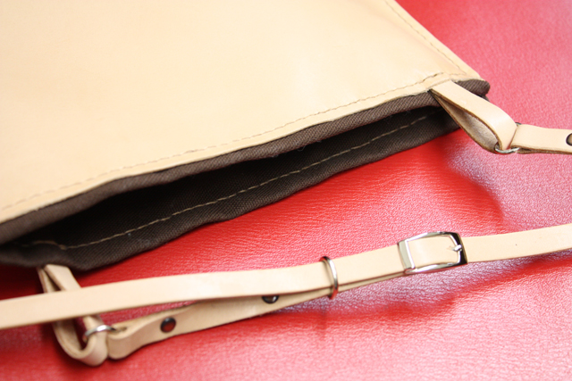 使ったのは茶色の帆布。サンキでハギレが安かったから。内布を付けず革のみで終了させようかとも思ったものの、かばんの中に入れたものに革のカスカスが付くのがいやなのと、内布を付けておけば、内側が痛んだらそれを交換することでより長持ちすると思ったから。