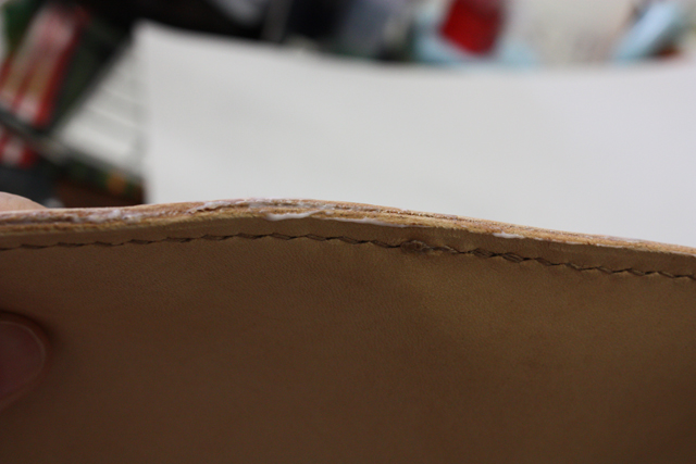 かばん本体の縫い合わせ面もトコノールを塗り、こする。ケバケバするのがやだから。かなり細かい作業だけど手は抜きません(`・ω・´)