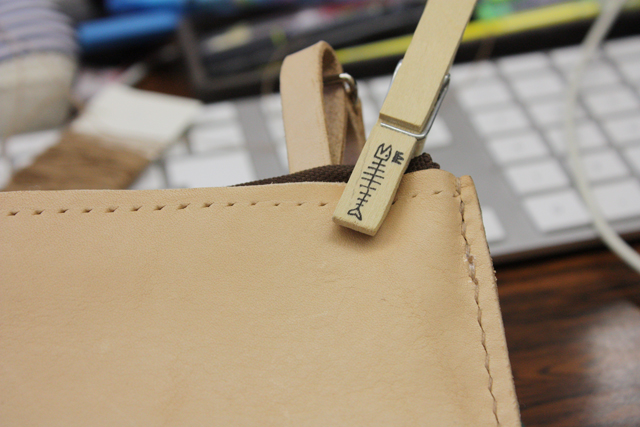 カバン本体のクチに手縫い用の穴をあけ、さらに帆布で作った内布を入れ込みます。縫いやすいように洗濯バサミなどで4箇所ほど固定。