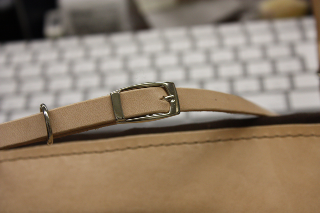 かばんのクチはこんな感じ。革と帆布を一緒に手縫いしてます。さらにこだわりのDカン。かばんの可動範囲が広がり、使いやすさにも影響するのです(`・ω・´)<たぶんな!