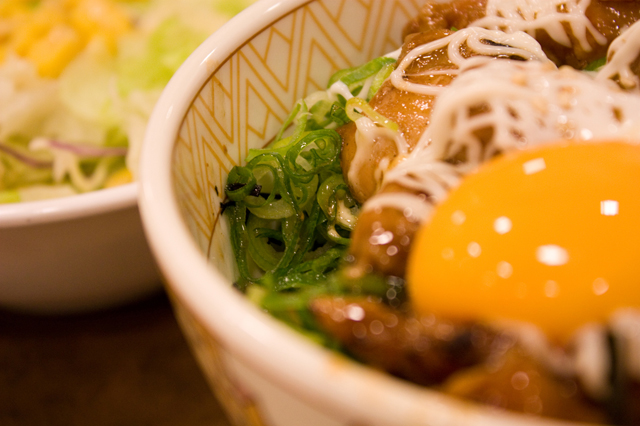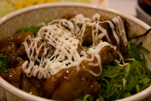 これは食べねばなるまい、と頼んだのが「とりマヨ丼」並480円+サラダみそ汁セット100円。