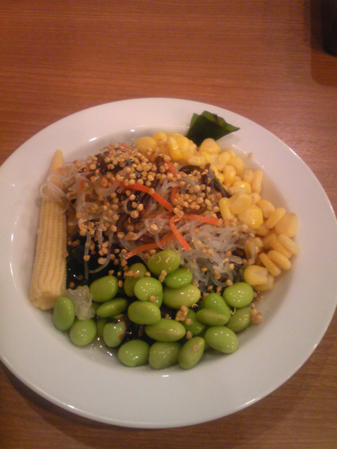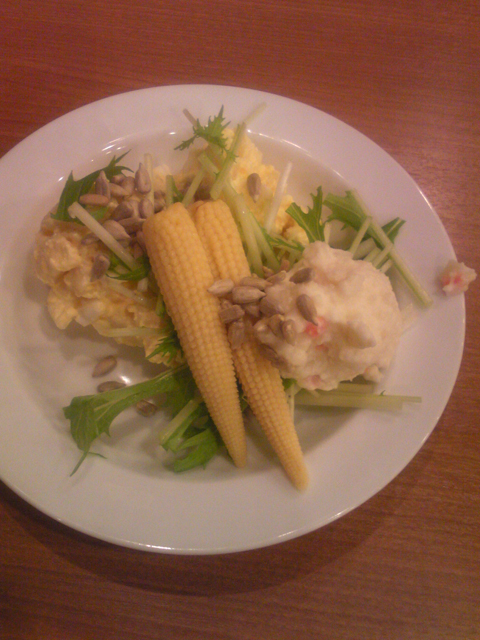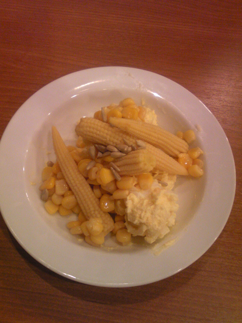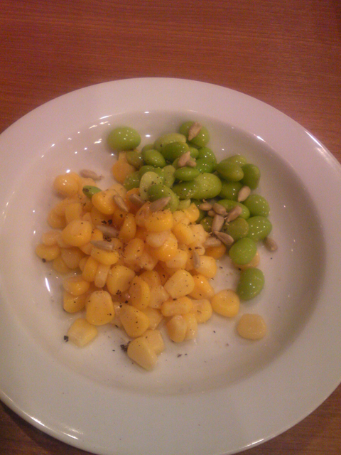 最後のひと皿は、スイートコーンと緑の豆(枝豆か?)を盛って、軽く塩をふり、さらに胡椒をかけただけ。これはちょっとはまる感覚。