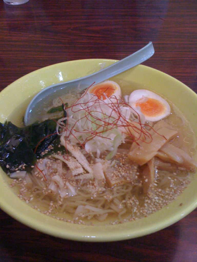 そこにメンマ、ワカメ、タマゴ、ネギ、糸唐辛子。あとゴマ。