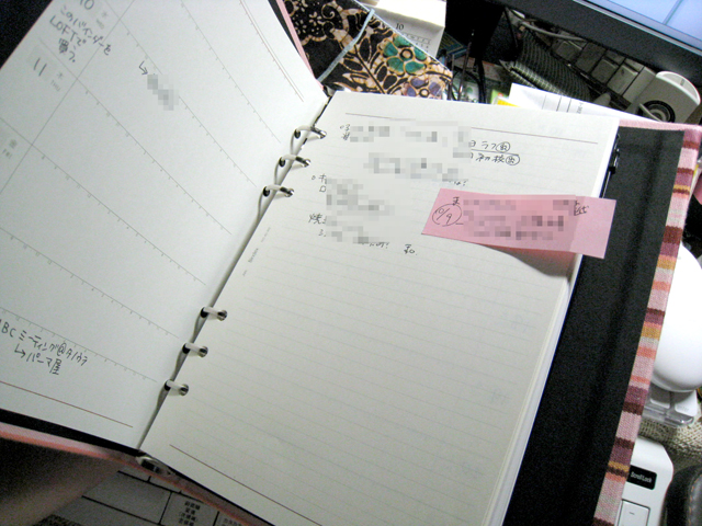 なので、ノートを手帳代わりにしてたときも、表紙の裏にふせんを貼り付けて使ってた。リングノートなら、表紙を折り返して使えば、デコボコも気にならないし。